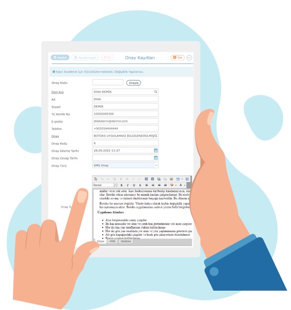 - Onay Kütüphanesi ile sistem üzerinde kayıtlı farklı dil ve branş seçeneğine sahip binlerce hazır onam formlarına tek bir tık ile ulaşabilirsiniz